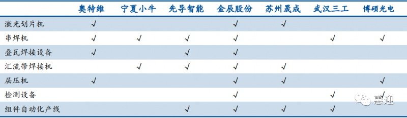 組件設(shè)備的市場較為分散,公司數(shù)量較多,競爭較為充分。組件設(shè)備國產(chǎn)化進程較早,廠商可提供多種產(chǎn)品,充分利用技術(shù)同源和客戶同源優(yōu)勢。如奧特維可提供激光劃片機、串焊機、疊瓦串焊機、層壓機等設(shè)備,先導(dǎo)智能可提供串焊機、疊瓦一體焊接機、匯流條焊接機等設(shè)備,金辰股份可提供激光劃片機、串焊機、疊片焊接機、層壓機、匯流條焊接機、層壓機、EL 測試儀等設(shè)備。同時,先導(dǎo)智能、金辰股份、蘇州晟成、武漢三工還可提供組件自動化生產(chǎn)線。