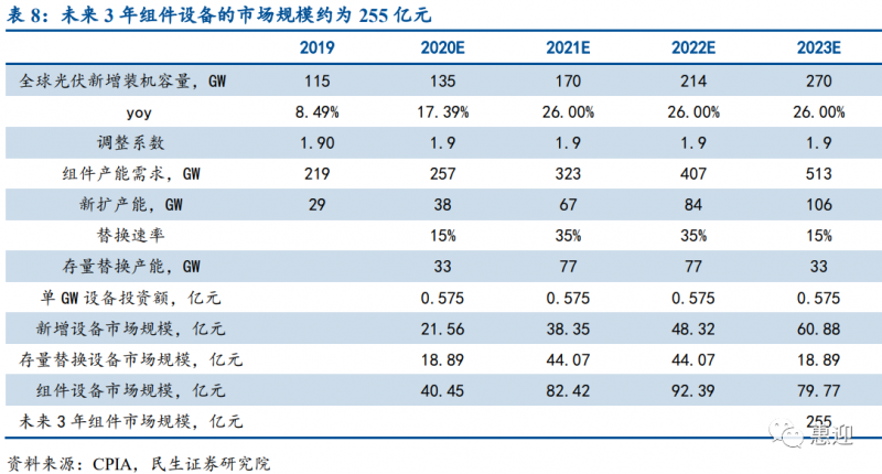 經(jīng)民生證券測算,預(yù)計 2021 年、2022 年、2023 年組件設(shè)備的市場規(guī)??煞謩e達到 82.42 億元、92.39 億元和 79.77 億元,未來 3 年組件設(shè)備的市場規(guī)模合計可達 255 億元,組件設(shè)備廠商擁有廣闊的發(fā)展前景。