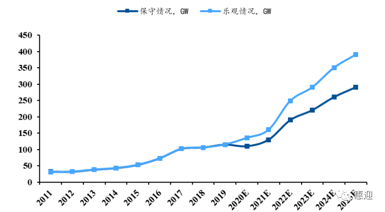 光伏行業(yè)降本提效穩(wěn)步推進,疊加全球各國可再生能源政策的頒布與執(zhí)行,預(yù)計全球光伏累計裝機容量將繼續(xù)保持增長態(tài)勢,根據(jù) CPIA 的預(yù)測,“十四五”期間,樂觀預(yù)期下,全球光伏裝機規(guī)模年均新增 287GW,中性情況下年均新增 222GW。該預(yù)期與 IRENA 于 2019 年年在分析報告《光伏的未來》給出的預(yù)測基本一致,IRENA 認為,到 2030 年光伏的裝機目標(biāo)將達到 8500GW,年均光伏新增規(guī)模將超過 250GW。