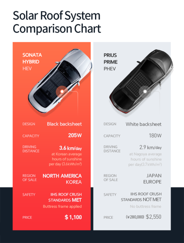現(xiàn)代公司表示,其太陽(yáng)能電池陣列系統(tǒng)與競(jìng)爭(zhēng)對(duì)手的汽車相比具有高效的設(shè)計(jì)優(yōu)勢(shì),如配備太陽(yáng)能車頂?shù)呢S田普銳斯。普銳斯有一個(gè)單獨(dú)的太陽(yáng)能電池,需要兩個(gè)階段的轉(zhuǎn)換來(lái)為高壓驅(qū)動(dòng)電池和輔助“啟動(dòng)”電池充電。索納塔只進(jìn)行一次轉(zhuǎn)換,直接通過(guò)電池板向最大功率點(diǎn)跟蹤器充電控制器輸送電力,并直接進(jìn)入輔助電池和驅(qū)動(dòng)電池。