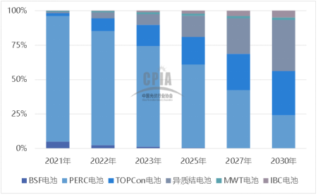 PERC技術(shù)基于其強(qiáng)大的性價比優(yōu)勢,以及產(chǎn)能布局,至少未來三年依舊是行業(yè)內(nèi)的主流技術(shù),各廠家也會積極提效降本來延長它的生命周期,根據(jù)CPIA的預(yù)測,到2025年,PERC電池市場占有率仍然超過50%,具體數(shù)據(jù)如圖6所示。