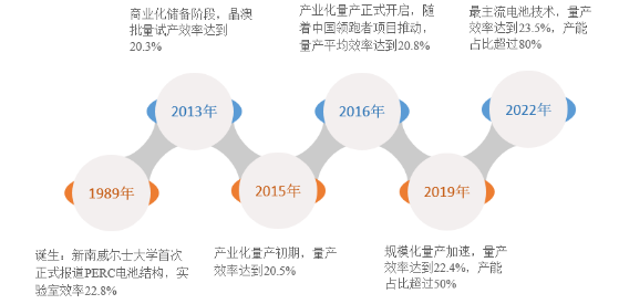 一般來講,行業(yè)內(nèi)將1989年趙建華博士首次正式公布PERC電池作為該項技術(shù)的起點,但直到20多年后的2013年,通過諸多廠家與機(jī)構(gòu)長期的技術(shù)儲備和研究,PERC技術(shù)才具備了量產(chǎn)化和商業(yè)化的基礎(chǔ),并在2015年正式啟動大規(guī)模量產(chǎn),經(jīng)歷了幾次量產(chǎn)化加速的過程之后,自2019年起首次超越BSF技術(shù)成為最主流的光伏電池技術(shù)。圖1展示了PERC電池自誕生以來的幾個重要時間節(jié)點。