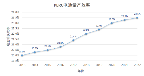 PERC電池技術(shù)具有強(qiáng)大的包容性,可以兼容各類電池技術(shù)乃至硅片端的技術(shù),在PERC技術(shù)被發(fā)明和應(yīng)用以來,其量產(chǎn)效率也從開始的20%左右一路提升到現(xiàn)在的23.5%左右,單年效率最大提升幅度達(dá)0.6%,2013年以來PERC電池的量產(chǎn)效率趨勢見圖4。預(yù)計在未來三年,PERC的量產(chǎn)效率可以達(dá)到24%左右。