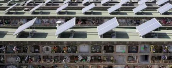 2008年,西班牙巴塞羅那附近小鎮(zhèn)桑塔克羅瑪將大量太陽能電池板安放到了一個“極少有人打攪的地方”——墓地。這個墓地的特別之處在于,462塊整齊劃一的太陽能電池板出現(xiàn)在墓地內(nèi)部,棺材一層層碼放起來,其中最高的“棺材樓”竟達(dá)到了五層,太陽能電池板就放在最高一層棺材上面。這些太陽能電池板生產(chǎn)的電能足夠滿足60戶居民的年需求,能讓該鎮(zhèn)一年減少向大氣中排放大約62噸二氧化碳。