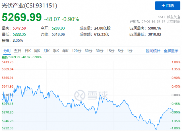 7月6日,光伏板塊迎來分化行情,中證光伏產(chǎn)業(yè)指數(shù)(CSI:931151)早盤在金剛線、組件、逆變器、設(shè)備個(gè)股的帶動(dòng)下創(chuàng)出近期反彈新高,隨后硅料、硅片個(gè)股震蕩下跌,拖累指數(shù)盤中跌幅一度達(dá)到1.78%。截至收盤,中證光伏產(chǎn)業(yè)指數(shù)報(bào)收5270點(diǎn),跌幅收窄至0.9%。