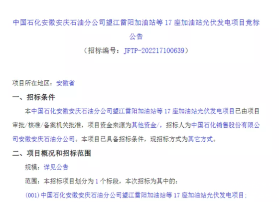 2022年9月28日,中國石化安徽安慶石油分公司望江雷陽加油站等17座加油站光伏發(fā)電項目競標(biāo)公告發(fā)布: