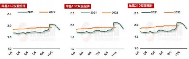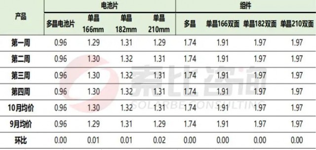 根據(jù)索比咨詢對多家組件制造商的調研:就10月組件價格行情來看,單晶166雙面均價1.91元/W,較9月環(huán)比持平;單晶182雙面均價1.97元/W,較9月環(huán)比持平;單晶210雙面均價1.97元/W,較9月環(huán)比持平。