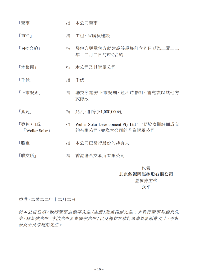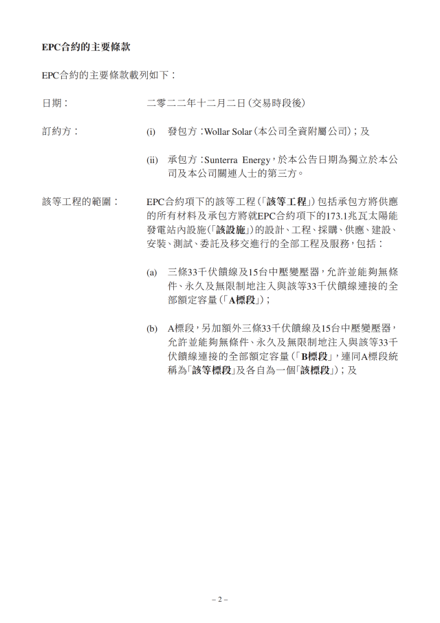12月2日,北京能源國(guó)際發(fā)布公告稱,于2022年12月2日公司全資附屬公司W(wǎng)ollar Solar,作為發(fā)包方與承包方Sunterra Energy訂立EPC合約。
