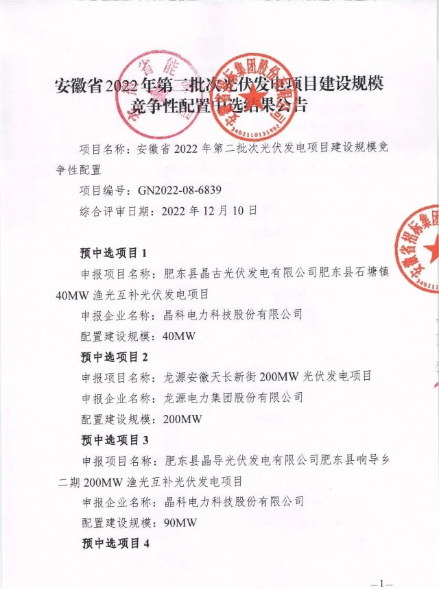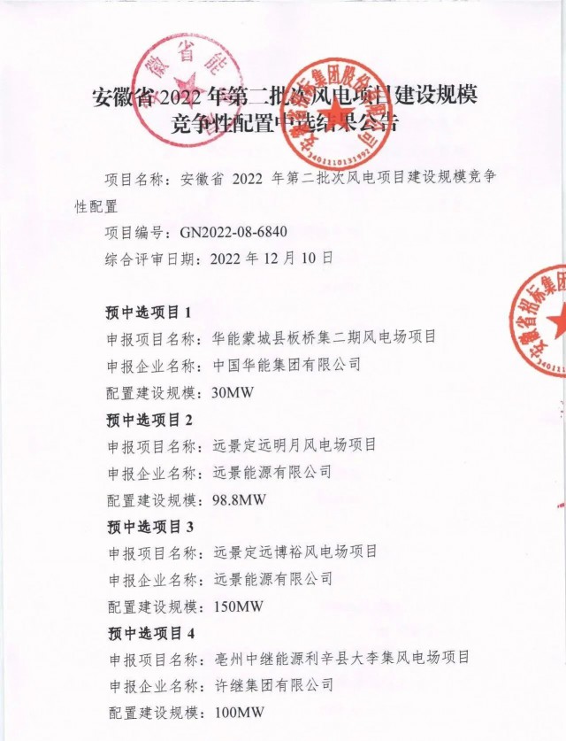 1月6日,安徽省能源局公示了2022年第二批光伏、風(fēng)電項(xiàng)目競爭性配置優(yōu)選結(jié)果,共計37個項(xiàng)目入選,其中光伏規(guī)模為1.5GW,項(xiàng)目20個;風(fēng)電項(xiàng)目規(guī)模為1.5GW,項(xiàng)目17個。