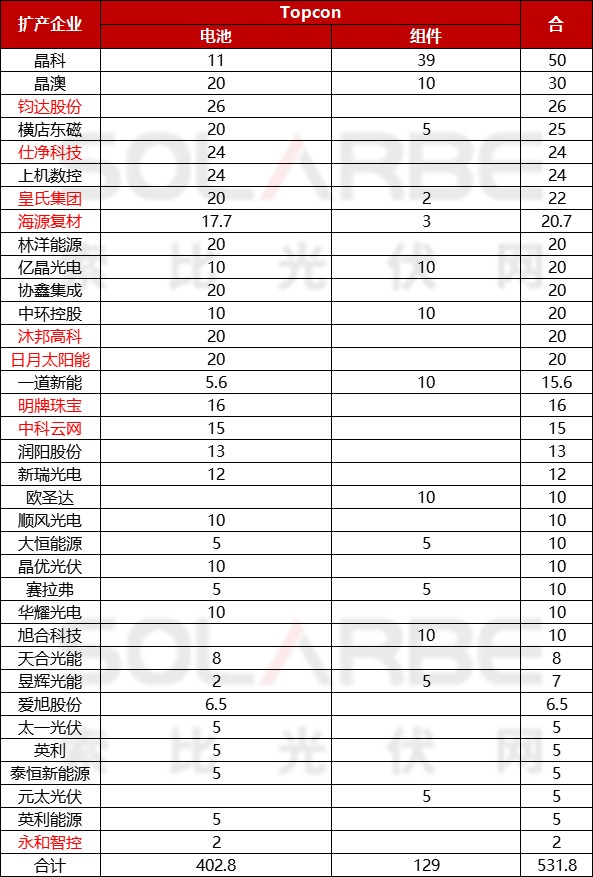 此外,橫店?yáng)|磁也加速TOPCon電池產(chǎn)能擴(kuò)張,宣布投資共計(jì)20GW Topcon電池、5GW Topcon組件。