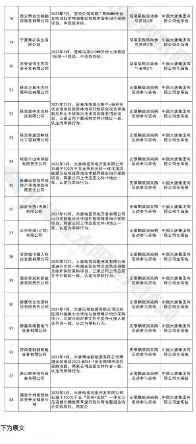 根據(jù)統(tǒng)計(jì),共有34個(gè)光伏相關(guān)企業(yè),17個(gè)光伏項(xiàng)目不良行為被大唐集團(tuán)處理,通知表示,相關(guān)供應(yīng)商可在上述處理期結(jié)束前1個(gè)月,向招標(biāo)人提出整改驗(yàn)收申請,經(jīng)相關(guān)單位或部門驗(yàn)收合格后方能解除處理。