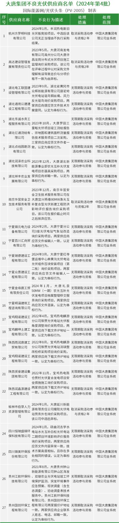 此前,大唐集團供應(yīng)商不良行為處理情況的公告(1-3批)發(fā)布。國際能源網(wǎng)/光伏頭條(PV-2005)經(jīng)過梳理,1-3批中共有58家企業(yè)與光伏行業(yè)相關(guān),共涉及28個項目。其中,55家企業(yè)被處罰原因為存在串標(biāo)行為,處理措施為無限期取消采購活動參與資格,處理范圍為中國大唐集團有限公司全系統(tǒng)。3家企業(yè)被處罰原因為中標(biāo)后棄標(biāo),處理措施為取消采購活動參與資格2年,處理范圍為中國大唐集團有限公司全系統(tǒng)。(詳情查看:黑榜!55家光伏供應(yīng)商被大唐永久拉黑?。?br />