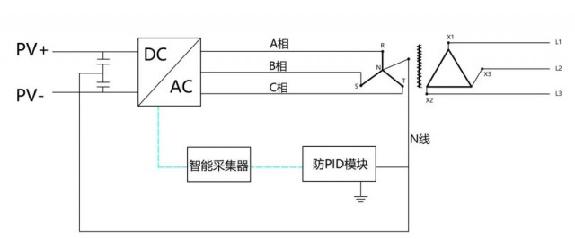 目前主流組件本身具備防PID效應(yīng)功能,此外,逆變器也可以附加該功能,通過抬升交流輸出側(cè)N線電壓,間接抬升PV負(fù)極電壓,使各臺(tái)逆變器的PV負(fù)極對(duì)地電壓接近為0或者稍高于0電位,以達(dá)到抑制PID效應(yīng)的目的。系統(tǒng)中數(shù)據(jù)采集器與逆變器和外置的防PID模塊連接通訊,自動(dòng)采集逆變器的負(fù)極狀態(tài)信息,自動(dòng)進(jìn)行抬升調(diào)節(jié),從而實(shí)現(xiàn)智能防PID功能。