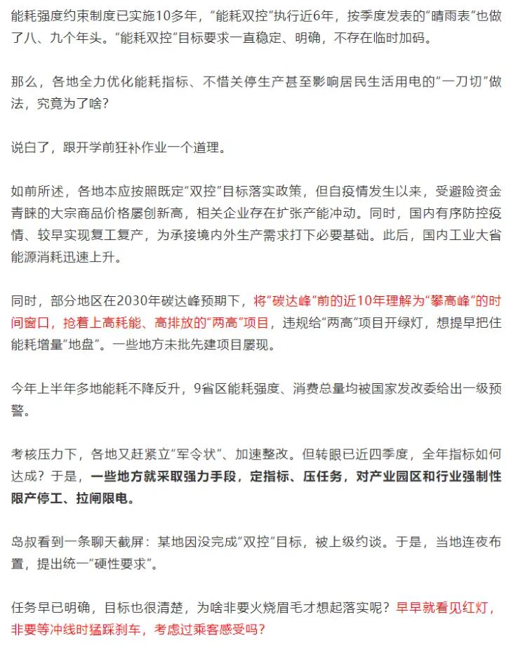 在這一政策的影響下,各地政府層層加碼,許多企業(yè)生產(chǎn)陷入停滯,甚至有部分地區(qū)居民生活用電、用水也受到影響。對此,人民日報海外版《俠客島》評論稱,平時不作為,臨近考核搞層層加碼、玩命突擊;平時高喊“綠色發(fā)展”口號,實際工作中卻一再追逐短期效益,這暴露出一些地方對新發(fā)展理念的認識偏差,對綠色低碳轉(zhuǎn)型的謀劃不積極,“跟開學(xué)前狂補作業(yè)一個道理。”