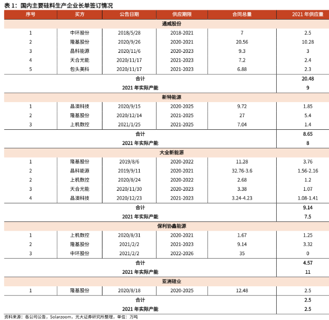 在經(jīng)歷了19年的硅料產(chǎn)能釋放周期后,2020年我國(guó)硅料產(chǎn)能增量有限,且海外OCI先后關(guān)停韓國(guó)兩家多晶硅工廠(總產(chǎn)能從7.9萬(wàn)噸滑落至3.2萬(wàn)噸),2020年國(guó)內(nèi)硅料在產(chǎn)產(chǎn)能從2019年的45.6萬(wàn)噸小幅提升至48.4萬(wàn)噸,全球硅料在產(chǎn)產(chǎn)能則從2019年底的62.2萬(wàn)噸減少1.9萬(wàn)噸至60.3萬(wàn)噸。2021年,國(guó)內(nèi)的新產(chǎn)能投放大多集中在Q4,因此對(duì)全年的實(shí)際產(chǎn)能貢獻(xiàn)有限,預(yù)計(jì)2021年全球的硅料供應(yīng)量約為55萬(wàn)噸,可滿(mǎn)足約170GW的硅片生產(chǎn)需求。與此同時(shí),下游的硅片廠商則在高利潤(rùn)留存的背景下在2019年開(kāi)啟了大規(guī)模擴(kuò)產(chǎn)浪潮。2019年在上游環(huán)節(jié)價(jià)格下跌的情況下硅片價(jià)格依然堅(jiān)挺,單晶硅片環(huán)節(jié)相較其他供應(yīng)鏈環(huán)節(jié)仍存在較高的利潤(rùn)空間,因此各硅片企業(yè)均開(kāi)啟了較為激進(jìn)的擴(kuò)張計(jì)劃,全國(guó)單晶硅片總名義產(chǎn)能從2019年的120GW擴(kuò)張至2020年的217GW。展望2021年,各大硅片龍頭及二、三線硅片企業(yè)仍維持了較大規(guī)模的產(chǎn)能擴(kuò)張節(jié)奏,2021年底的單晶硅片名義產(chǎn)能有望再創(chuàng)新高突破300GW。在2021年硅料實(shí)際貢獻(xiàn)有限、而硅片產(chǎn)能大幅擴(kuò)張的背景下,硅片廠商于2020Q3開(kāi)始密集通過(guò)和上游硅料企業(yè)簽訂鎖量不鎖價(jià)的硅料供貨長(zhǎng)協(xié)鎖定硅料供應(yīng),從而滿(mǎn)足自身的生產(chǎn)需求。根據(jù)我們的統(tǒng)計(jì),2021年已有超過(guò)80%的硅料產(chǎn)能被長(zhǎng)協(xié)合同鎖定,主流硅料生產(chǎn)廠商中僅有保利協(xié)鑫的部分硅料產(chǎn)能尚未簽訂長(zhǎng)協(xié)合同。