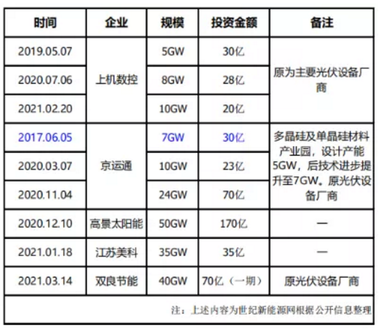 縱觀近幾年光伏行業(yè),擴(kuò)產(chǎn)兇猛。如三一集團(tuán)一樣跨界進(jìn)入硅片行業(yè)的企業(yè)并不少。據(jù)世紀(jì)新能源網(wǎng)不完全統(tǒng)計(jì),近兩年“跨界”或者突入、發(fā)力硅片板塊的企業(yè)并不少,較具代表性的主要為五家,分別為上機(jī)數(shù)控、京運(yùn)通、雙良節(jié)能、高晶太陽(yáng)能、美科,僅此五家,所涉及的硅片產(chǎn)能超180GW,總投超440億。