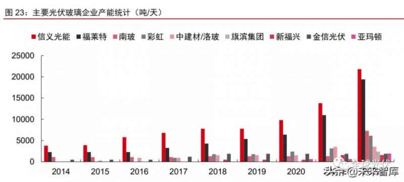 2021年光伏玻璃價(jià)格大幅回落,2022年價(jià)格或?qū)⒕S持中低位波動(dòng)。光伏玻璃供需格局的變化也反應(yīng)在企業(yè)庫(kù)存。據(jù)卓創(chuàng)資訊統(tǒng)計(jì),2021H1,隨著行業(yè)產(chǎn)能擴(kuò)張以及需求延后,光伏玻璃行業(yè)主流廠商庫(kù)存天數(shù)由年初10天以內(nèi)快速增至40天左右;受此影響,光伏玻璃價(jià)格也于4月從高點(diǎn)出現(xiàn)“腰斬式”下跌。隨著Q3后庫(kù)存逐步消化回落,以及受純堿價(jià)格大幅上漲推動(dòng),光伏玻璃價(jià)格從底部開始有所回升,目前3.2mm產(chǎn)品價(jià)格約30元/平米,2.0mm產(chǎn)品價(jià)格約23元/平米。展望2022年,我們認(rèn)為在原材料成本有望逐步回落,且行業(yè)供需格局總體保持寬松的情況下,光伏玻璃價(jià)格有望在中低水平整體保持穩(wěn)定,預(yù)計(jì)3.2mm和2.0mm玻璃價(jià)格或?qū)⒃?5元/平米和20元/平米的中樞附件波動(dòng)。