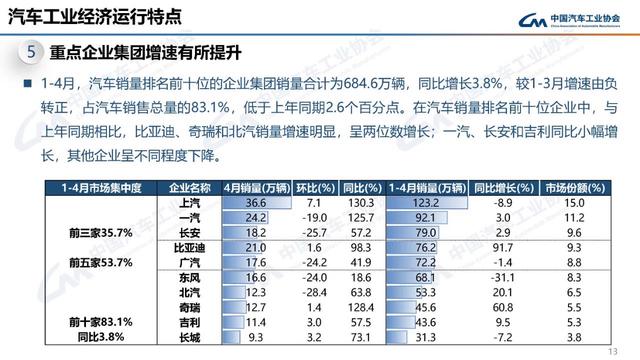 五是重點企業(yè)集團增速有所提升。1-4月,汽車銷量排名前十位的企業(yè)集團銷量合計為684.6萬輛,同比增長3.8%,較1-3月增速由負轉(zhuǎn)正,占汽車銷售總量的83.1%,低于上年同期2.6個百分點。在汽車銷量排名前十位企業(yè)中,與上年同期相比,比亞迪、奇瑞和北汽銷量增速明顯,呈兩位數(shù)增長,一汽、長安和吉利同比小幅增長,其他企業(yè)呈不同程度下降。