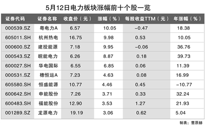 同花順數(shù)據(jù)顯示,5月12日截至收盤,電力板塊指數(shù)漲1.03%,粵電力A、杭州熱電、建投能源3只個股均漲停,另有皖能電力、華電國際2只個股均漲超5%,分別為8.87%、6.85%。