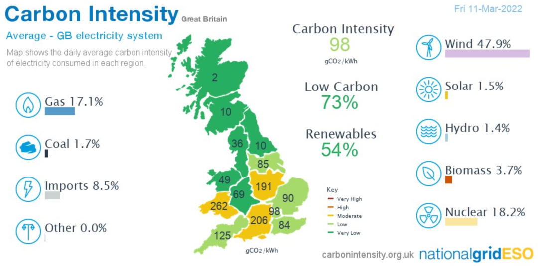 據(jù)英國(guó)國(guó)家電網(wǎng)數(shù)據(jù),2022年3月11日(星期五)風(fēng)力發(fā)電占英國(guó)電力的47.9%,其次是核能18.2%,天然氣17.1%,進(jìn)口電力8.5%,生物質(zhì)3.7%,煤炭1.7%,太陽(yáng)能1.5%,水力1.4%。