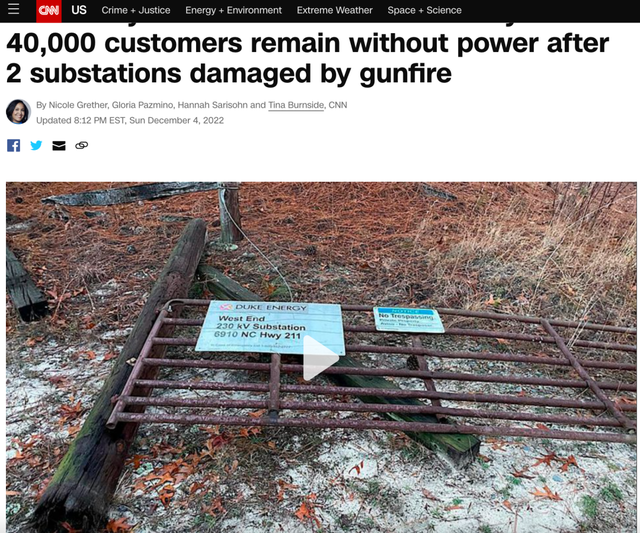 據(jù)美國(guó)有線電視新聞網(wǎng)(CNN)當(dāng)?shù)貢r(shí)間12月4日?qǐng)?bào)道,因兩個(gè)變電站被槍擊破壞,美國(guó)北卡羅來(lái)納州摩爾縣(Moore County)正在經(jīng)歷大范圍停電,近4萬(wàn)名用戶受到影響。