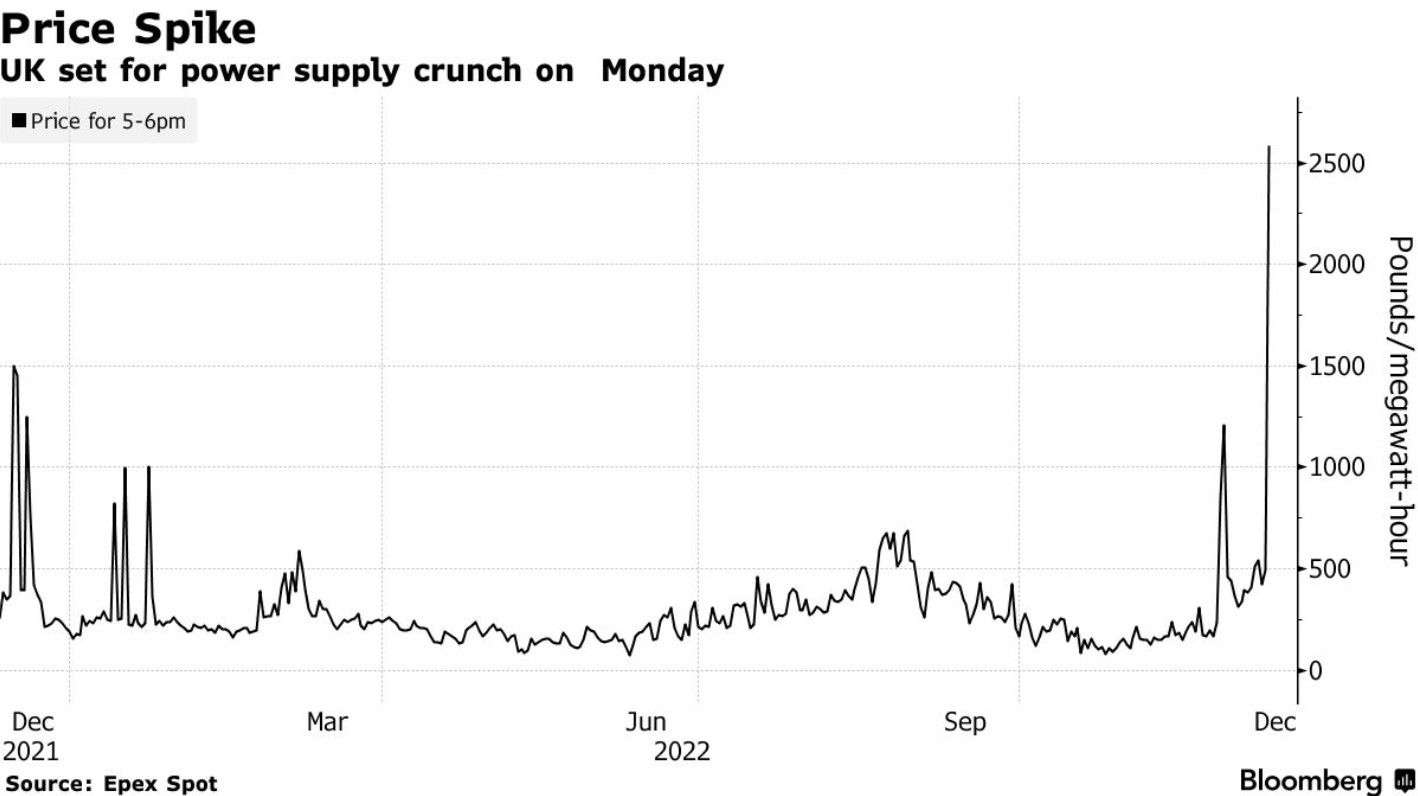 由于寒冷的氣溫將導(dǎo)致電力需求激增,再加上風(fēng)力發(fā)電量下降導(dǎo)致供應(yīng)短缺,英國(guó)電力價(jià)格周一飆升至創(chuàng)紀(jì)錄水平。據(jù)數(shù)據(jù)顯示,英國(guó)電力價(jià)格日前以創(chuàng)紀(jì)錄的每兆瓦時(shí)674.78英鎊結(jié)算,而周一電力價(jià)格則創(chuàng)下每兆瓦時(shí)2585.80英鎊的歷史新高。