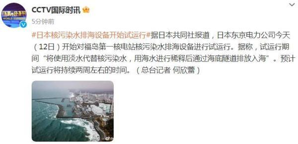據(jù)日本共同社報(bào)道,日本東京電力公司今天(6月12日)開始對(duì)福島第一核電站核污染水排海設(shè)備進(jìn)行試運(yùn)行。據(jù)稱,試運(yùn)行期間“將使用淡水代替核污染水,用海水進(jìn)行稀釋后通過海底隧道排放入海”。預(yù)計(jì)試運(yùn)行將持續(xù)兩周左右的時(shí)間。