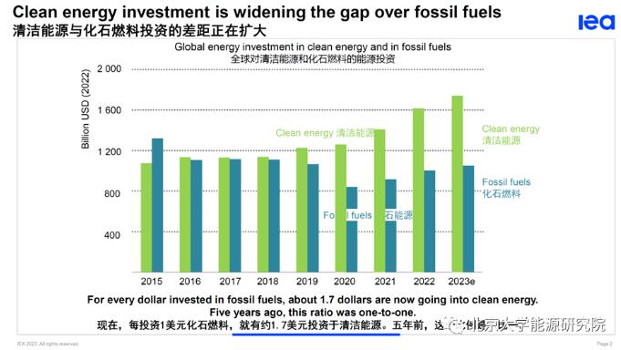 近日,國際能源署《2023世界能源投資》報告在北京發(fā)布。國際能源署首席能源經(jīng)濟學家Tim Gould介紹,五年前,清潔能源與化石能源的投資比為1:1,如今這一比例已擴大至1.7:1。同時,太陽能領域的投資將會在2023年首次超過石油生產(chǎn)投資。