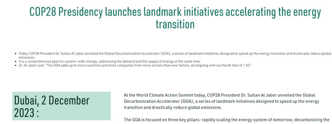 COP28 主席蘇丹·賈比爾周六宣布了“全球脫碳加速計劃”(GDA),該計劃專注于三個關(guān)鍵支柱:快速擴展未來的能源系統(tǒng);促進當(dāng)今的能源系統(tǒng)脫碳;并針對甲烷和其他非二氧化碳溫室氣體 (GHG)的行動。