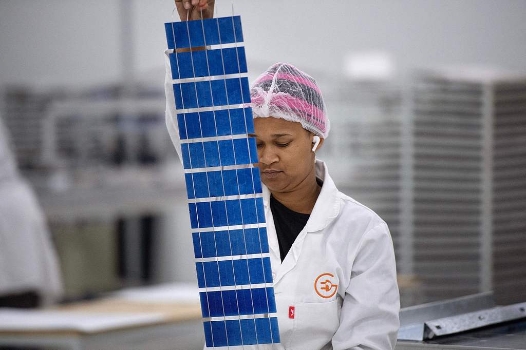 當(dāng)?shù)貢r間2023年10月25日,南非開普敦,一名婦女在只有女性員工的太陽能電池板工廠“非洲能源”檢查組件。
