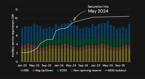 Modo Energy公司在美國儲能峰會上播放的演示幻燈片顯示了其預(yù)計德克薩斯州輔助服務(wù)市場何時飽和