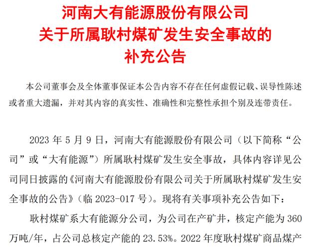 公告顯示,耿村煤礦系大有能源分公司,為公司在產(chǎn)礦井,核定產(chǎn)能為 360 萬噸/年,占公司總核定產(chǎn)能的 23.53%。2022 年度耿村煤礦商品煤產(chǎn) 量 287.45 萬噸,營業(yè)收入 13.22 億元,分別占公司同期商品煤產(chǎn)量 的 24.83%和營業(yè)收入的 15.39%。2023 年第一季度耿村煤礦商品煤產(chǎn) 量 51.51 萬噸,營業(yè)收入 2.15 億元,分別占公司同期商品煤產(chǎn)量的 18.32%和營業(yè)收入的 10.73%。目前,耿村煤礦正在組織實施停產(chǎn)救援,對公司造成的影響暫無法預測。公司將持續(xù)關注事故后續(xù)進展并及時履行信息披露義務,敬請廣大投資者注意投資風險。
