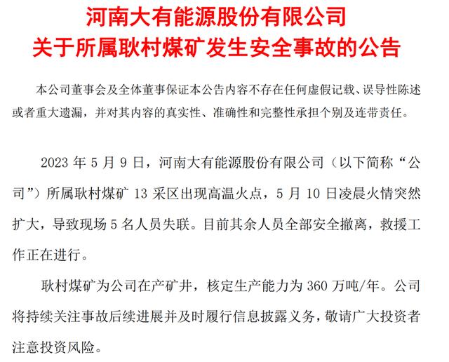 5月10日晚間大有能源公告,2023年5月9日,公司所屬耿村煤礦13采區(qū)出現(xiàn)高溫火點,5月10日凌晨火情突然擴大,導致現(xiàn)場5名人員失聯(lián)。目前其余人員全部安全撤離,救援工作正在進行。