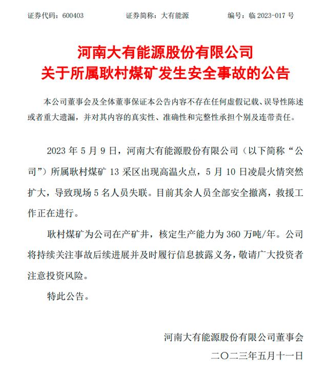 2023年5月9日,河南大有能源股份有限公司耿村煤礦13采區(qū)出現(xiàn)高溫火點(diǎn),5月10日凌晨火情突然擴(kuò)大,導(dǎo)致現(xiàn)場5名人員失聯(lián)。