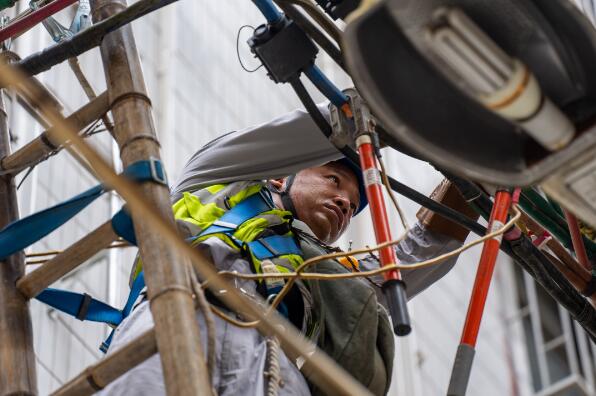 南方電網(wǎng)深圳龍崗供電局工作人員為城中村更換線路,迎接即將到來(lái)的夏季負(fù)荷高峰。