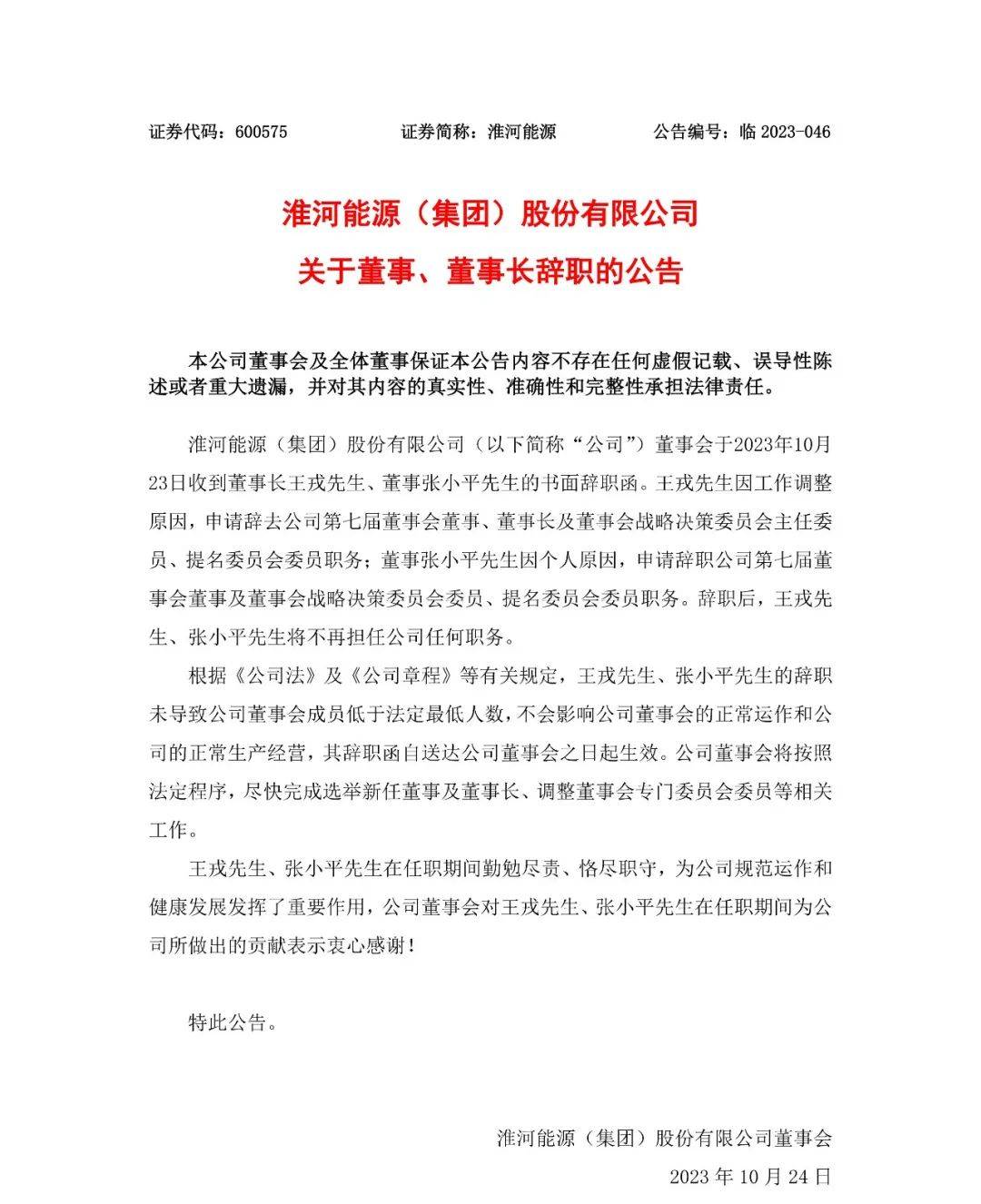 10月23日,淮河能源發(fā)布公告,董事會于2023年10月23日收到董事長王戎先生、董事張小平先生的書面辭職函。王戎先生因工作調(diào)整原因,申請辭去公司第七屆董事會董事、董事長及董事會戰(zhàn)略決策委員會主任委員、提名委員會委員職務(wù);董事張小平先生因個(gè)人原因,申請辭職公司第七屆董事會董事及董事會戰(zhàn)略決策委員會委員、提名委員會委員職務(wù)。