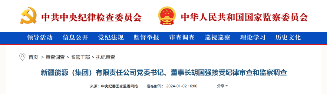 據(jù)中央紀(jì)委國家監(jiān)委網(wǎng)站1月2日消息,據(jù)新疆維吾爾自治區(qū)紀(jì)委監(jiān)委消息:新疆能源(集團)有限責(zé)任公司黨委書記、董事長胡國強涉嫌嚴(yán)重違紀(jì)違法,目前正接受新疆維吾爾自治區(qū)紀(jì)委監(jiān)委紀(jì)律審查和監(jiān)察調(diào)查。