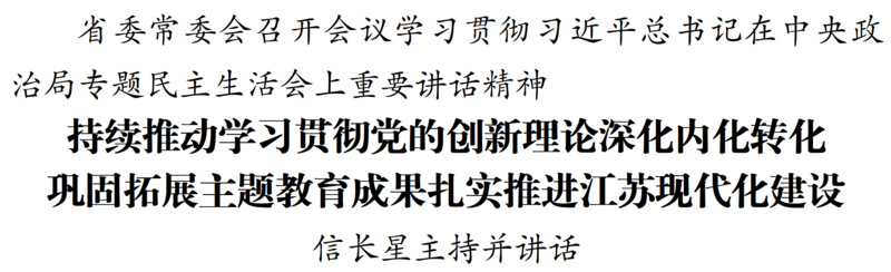 1月8日,江蘇省委常委會(huì)召開(kāi)會(huì)議,深入學(xué)習(xí)領(lǐng)會(huì)習(xí)近平總書(shū)記在中央政治局專題民主生活會(huì)上的重要講話和中央通報(bào)精神,認(rèn)真對(duì)照檢查,明確改進(jìn)方向。省委書(shū)記信長(zhǎng)星主持會(huì)議并講話。省委常委同志交流學(xué)習(xí)體會(huì)。會(huì)上通報(bào)了省委常委會(huì)專題民主生活會(huì)查擺問(wèn)題整改落實(shí)、主題教育省級(jí)層面專項(xiàng)整治情況。