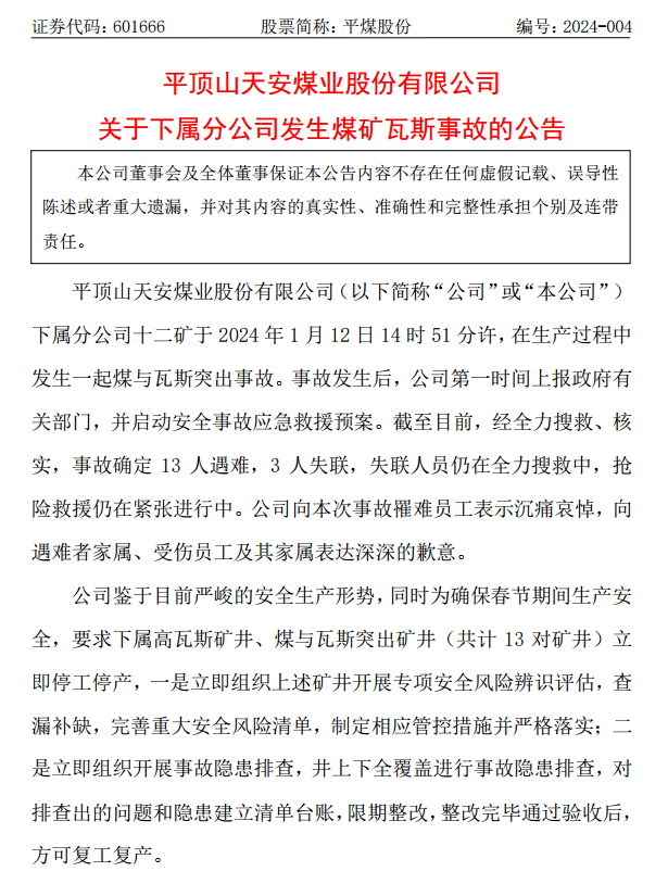 1月14日訊,平煤股份公告,下屬分公司十二礦于1月12日14時(shí)51分許,在生產(chǎn)過(guò)程中發(fā)生一起煤與瓦斯突出事故。截至目前,經(jīng)全力搜救、核實(shí),事故確定13人遇難,3人失聯(lián),失聯(lián)人員仍在全力搜救中,搶險(xiǎn)救援仍在緊張進(jìn)行中。