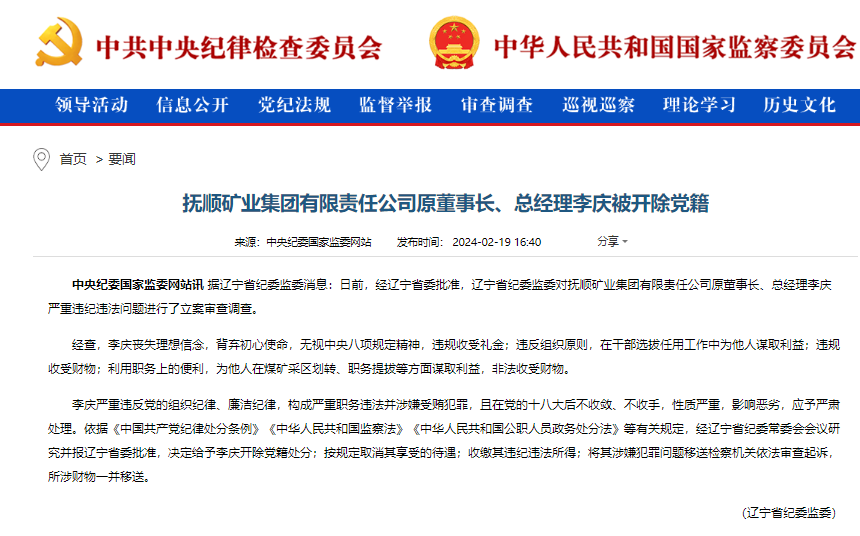 據(jù)遼寧省紀(jì)委監(jiān)委消息:日前,經(jīng)遼寧省委批準(zhǔn),遼寧省紀(jì)委監(jiān)委對撫順礦業(yè)集團(tuán)有限責(zé)任公司原董事長、總經(jīng)理李慶嚴(yán)重違紀(jì)違法問題進(jìn)行了立案審查調(diào)查。