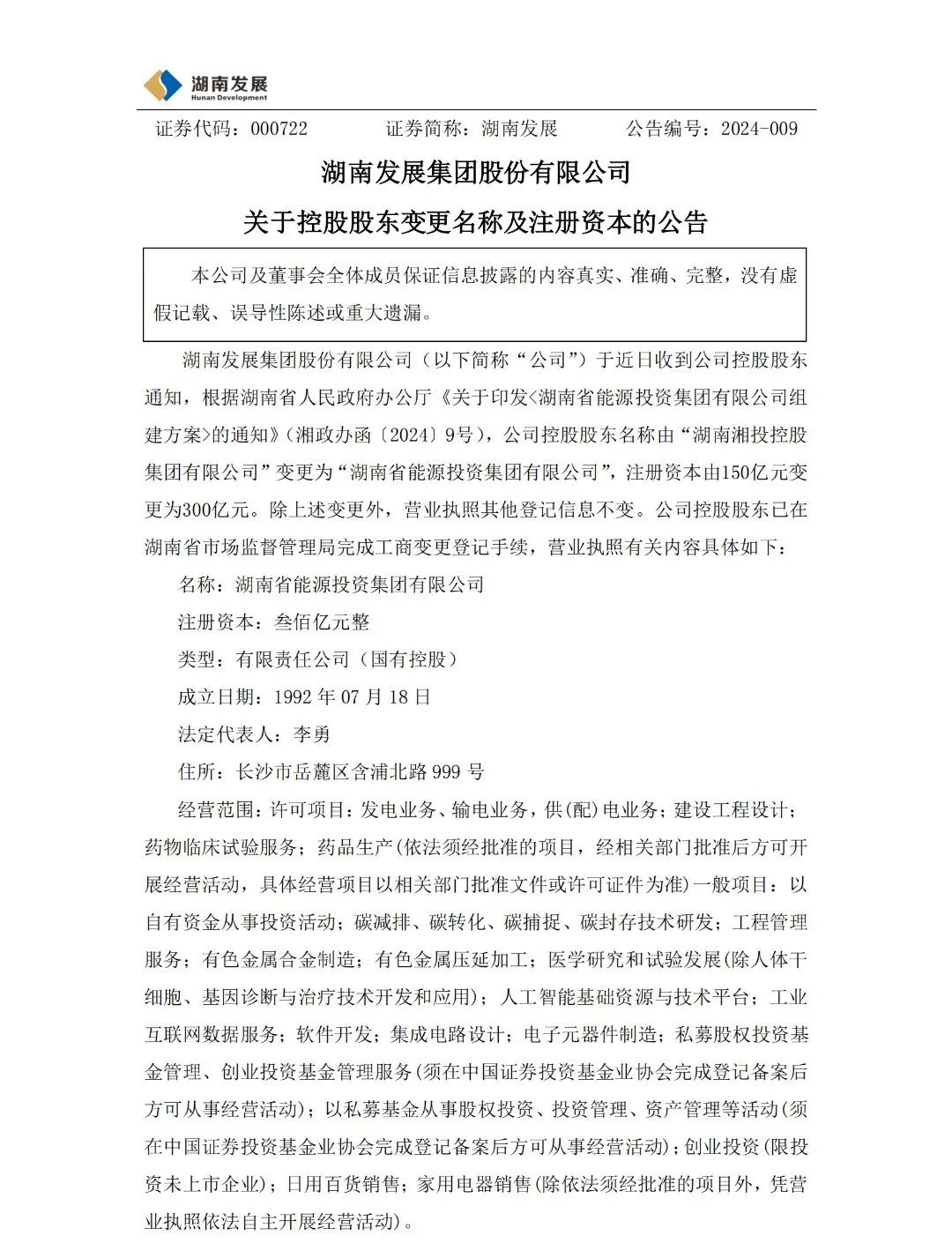 2月27日,湖南發(fā)展集團(tuán)股份有限公司發(fā)布關(guān)于控股股東變更名稱及注冊資本的公告,公告顯示:湖南發(fā)展集團(tuán)股份有限公司于近日收到公司控股股東通知,根據(jù)湖南省人民政府辦公廳《關(guān)于印發(fā)<湖南省能源投資集團(tuán)有限公司組建方案>的通知》(湘政辦函〔2024〕9號),公司控股股東名稱由“湖南湘投控股集團(tuán)有限公司”變更為“湖南省能源投資集團(tuán)有限公司”,注冊資本由150億元變更為300億元。除上述變更外,營業(yè)執(zhí)照其他登記信息不變。公司控股股東已在湖南省市場監(jiān)督管理局完成工商變更登記手續(xù)。