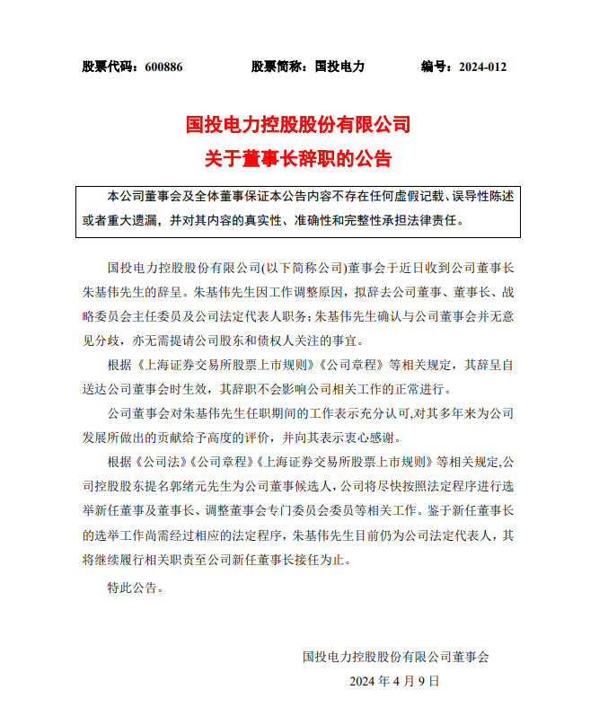 4月9日,國投電力發(fā)布公告稱,公司董事會(huì)于近日收到公司董事長朱基偉先生的辭呈。朱基偉先生因工作調(diào)整原因,擬辭去公司董事、董事長、戰(zhàn)略委員會(huì)主任委員及公司法定代表人職務(wù);朱基偉先生確認(rèn)與公司董事會(huì)并無意見分歧,亦無需提請(qǐng)公司股東和債權(quán)人關(guān)注的事宜。