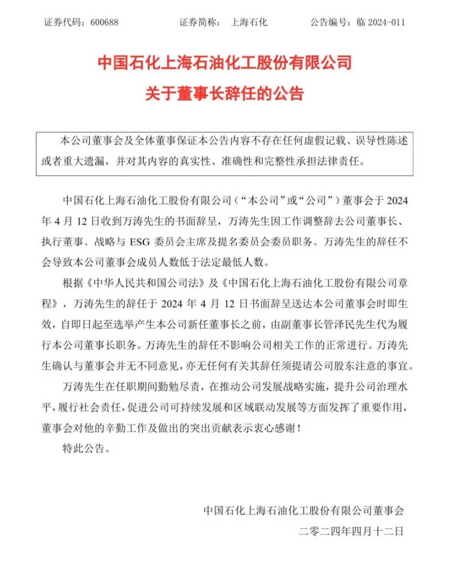 上海石化發(fā)布公告稱,公司董事會(huì)4月12日收到萬(wàn)濤先生的書(shū)面辭呈,萬(wàn)濤先生因工作調(diào)整辭去公司董事長(zhǎng)、執(zhí)行董事、戰(zhàn)略與 ESG 委員會(huì)主席及提名委員會(huì)委員職務(wù) 。