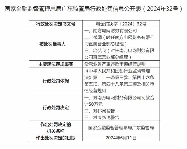 臺(tái)海網(wǎng)6月19日訊 根據(jù)國(guó)家金融監(jiān)督管理總局網(wǎng)站近日發(fā)布的行政處罰信息公開表(粵金罰決字〔2024〕32號(hào))顯示,因貸款業(yè)務(wù)嚴(yán)重違反審慎經(jīng)營(yíng)規(guī)則,國(guó)家金融監(jiān)督管理總局廣東監(jiān)管局對(duì)南方電網(wǎng)財(cái)務(wù)有限公司罰款合計(jì)50萬元。