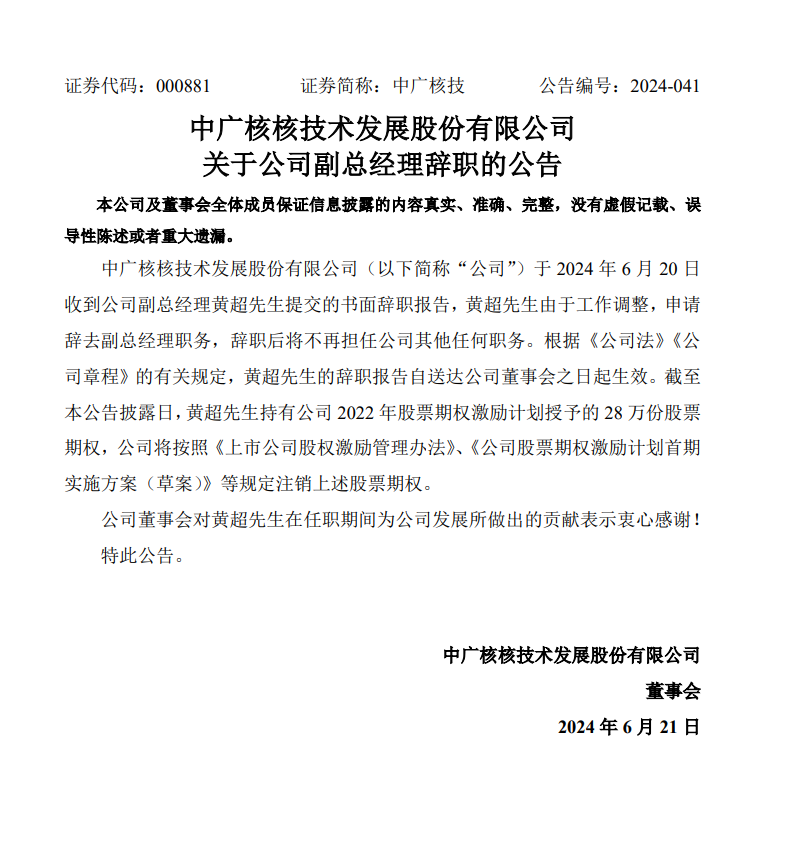 6月21日,中廣核技發(fā)布公告稱(chēng),公司于6月20日收到公司副總經(jīng)理黃超先生提交的書(shū)面辭職報(bào)告,黃超先生由于工作調(diào)整,申請(qǐng)辭去副總經(jīng)理職務(wù),辭職后將不再擔(dān)任公司其他任何職務(wù)。