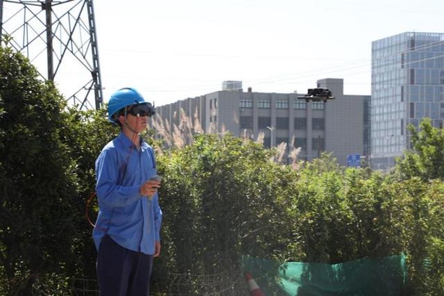 圖為工作人員應(yīng)用飛行眼鏡操控?zé)o人機(jī),對配電線路開展沉浸式巡線。