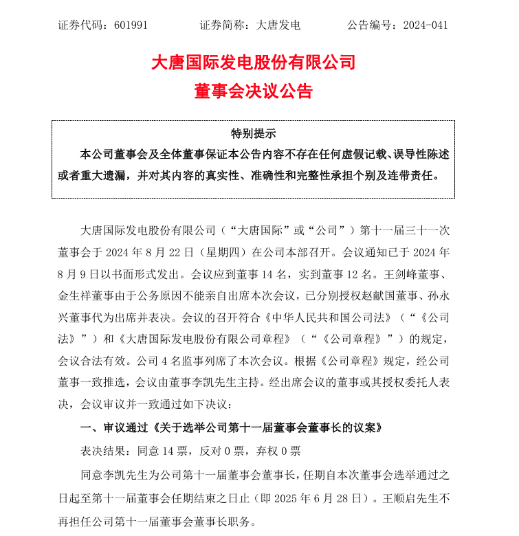 8月23日,大唐發(fā)電公告稱,董事會(huì)審議通過《關(guān)于選舉公司第十一屆董事會(huì)董事長的議案》,同意李凱先生為公司第十一屆董事會(huì)董事長,任期自本次董事會(huì)選舉通過之 日起至第十一屆董事會(huì)任期結(jié)束之日止(即2025年6月28日)。王順啟先生不再擔(dān)任公司第十一屆董事會(huì)董事長職務(wù)。