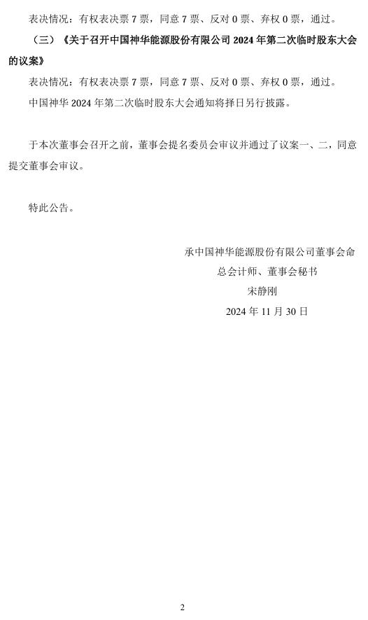 中國神華11月30日發(fā)布公告,公司第六屆董事會第四次會議于2024年11月26日以電子郵件及無紙化辦公系統(tǒng)方式向全體董事和監(jiān)事發(fā)送了會議通知、議案等會議材料,并于2024年11月29日以書面審議方式召開。公司全體7名董事審議了本次董事會議案,以書面形式發(fā)表了表決意見。