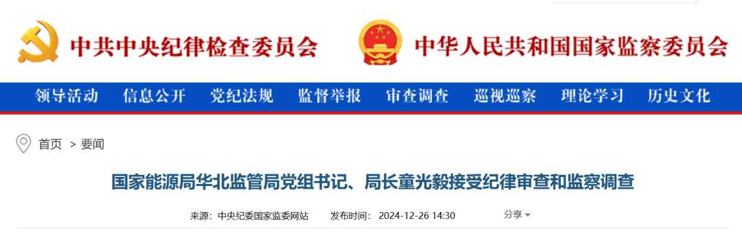 中央紀委國家監(jiān)委網站12月26日消息,據(jù)中央紀委國家監(jiān)委駐國家發(fā)展改革委紀檢監(jiān)察組、內蒙古自治區(qū)紀委監(jiān)委消息:國家能源局華北監(jiān)管局黨組書記、局長童光毅涉嫌嚴重違紀違法,目前正接受中央紀委國家監(jiān)委駐國家發(fā)展改革委紀檢監(jiān)察組紀律審查和內蒙古自治區(qū)包頭市監(jiān)察委員會監(jiān)察調查。