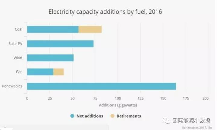 國際能源署發(fā)布2017年可再生能源報告,確認2016年全球新增可再生能源裝機165吉瓦,其中太陽能光伏裝機達到74吉瓦(約46%來自中國),首次超過煤電新增裝機(57吉瓦)。